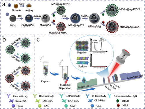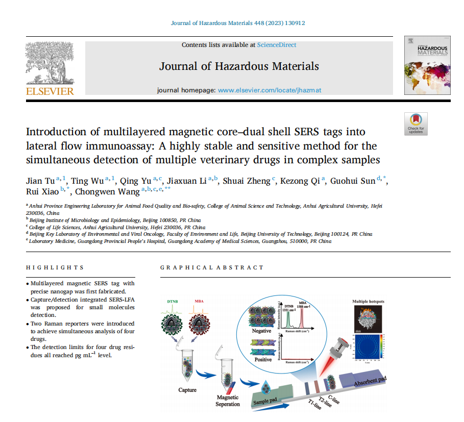 本网讯 近日,我校安徽省动物性食品质量与生物安全工程实验室与军事医学研究院等单位合作,在学术期刊《Journal of Hazardous Materials》上发表了题为“Introduction of multilayered magnetic core–dual shell SERS tags into lateral flow immunoassay: A highly stable and sensitive method for the simultaneous detection of multiple veterinary drugs in complex samples”(中科院一区top,IF:14.224)的研究论文。