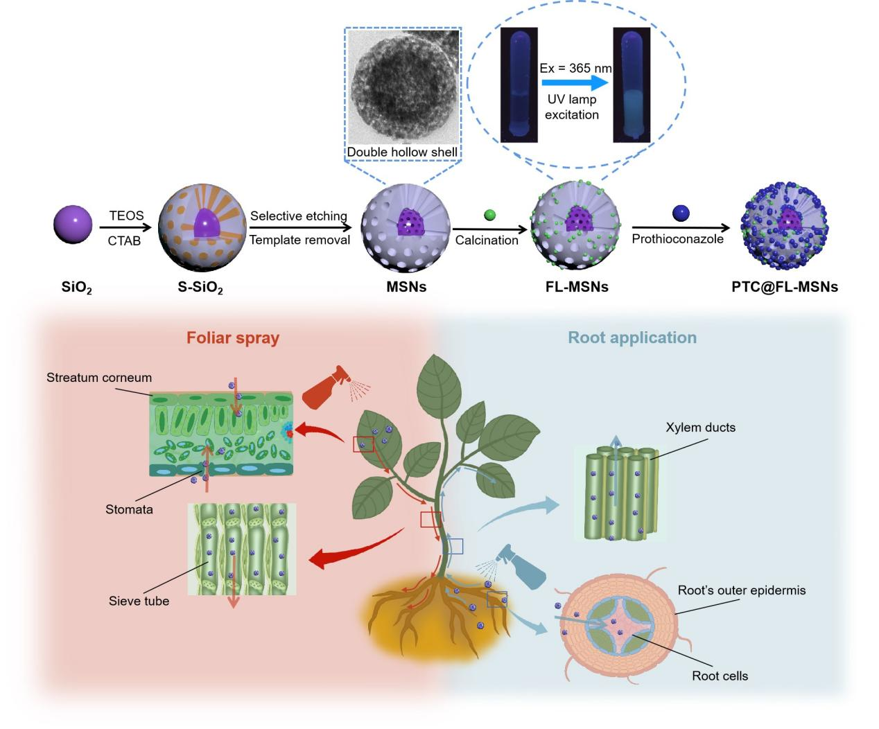 近年来,利用纳米材料作为载体制备纳米农药、控制农药释放引起科学人员的广泛兴趣。然而迄今很少有研究纳米载体对农药代谢产物的影响,并探究在不同施药方式下,纳米农药在植物体内可视化传导路径。该研究首次设计合成了碳量子点修饰的荧光双空心壳介孔二氧化硅复合载药体系并负载广谱三唑硫酮类杀菌剂丙硫菌唑(PTC@FL-MSNs),通过荧光显微镜可观察到该纳米农药能够通过根、叶吸收在大豆植株内传导。与30%丙硫菌唑可分散油悬浮剂相比,该丙硫菌唑纳米颗粒表现出更好的抑菌活性,并且减少了脱硫丙硫菌唑的产生,提高了农药利用率。该团队设计合成的新型农药运输载体,为未来构建智能、高效的农药递送体系提供新思路,也能够为农药减量化提供理论与技术支撑。