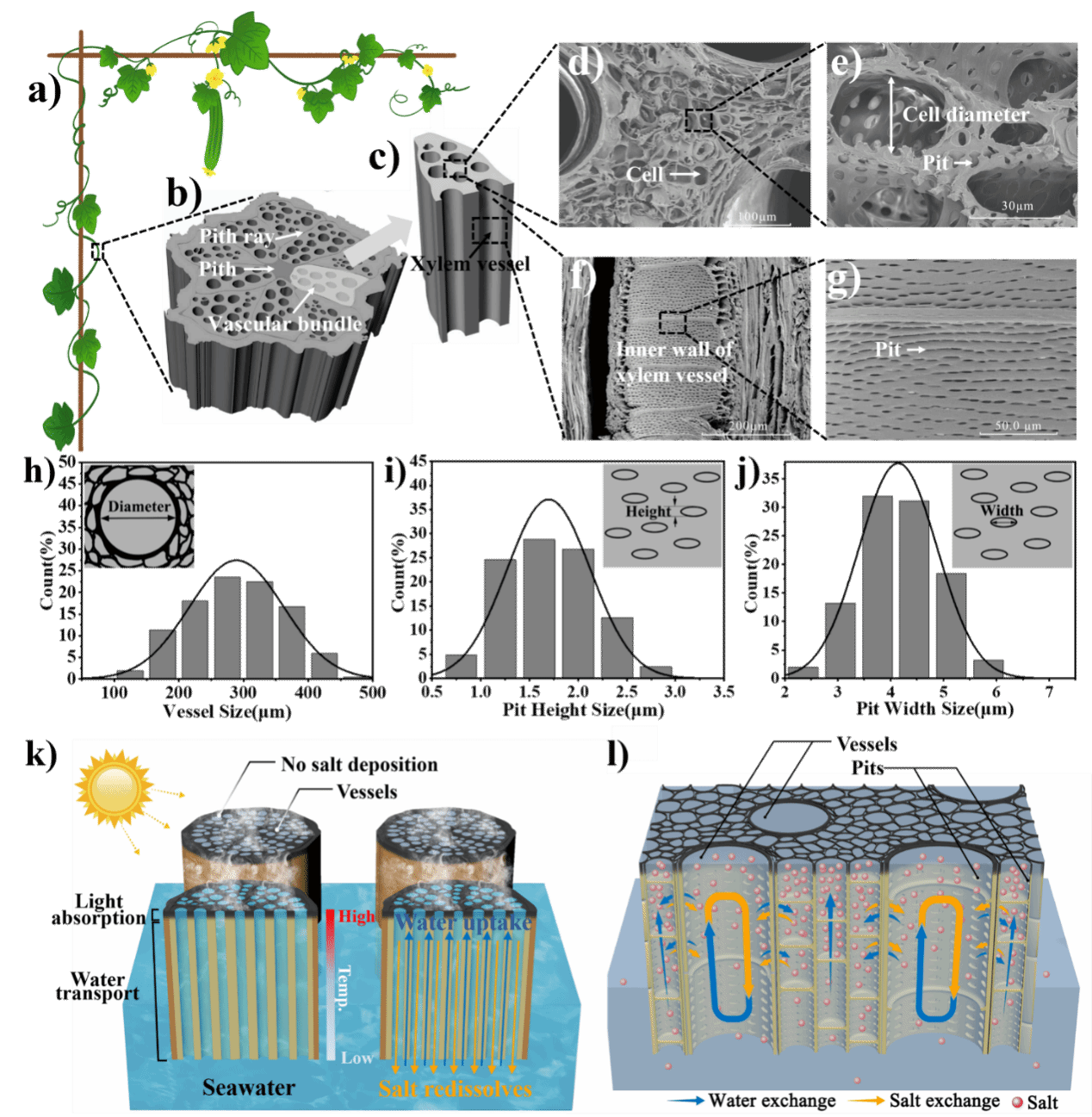 本网讯 近日,我校林学与园林学院陈玉霞教授和郭勇教授在中科院一区top期刊《清洁生产》(《Journal of Cleaner Production》)发表了题为《源于天然丝瓜藤的高性能海水淡化系统:一种简单、高效、环保的生物基太阳能蒸发器解决方案》(High-performance desalination systems from Natural Luffa Vine: A simple, efficient and environmentally friendly solution for bio-based solar evaporators)的文章。该研究受植物藤蔓超强水分输送能力和特殊孔隙结构的启发,利用天然和简单工艺改性丝瓜藤制备太阳能海水淡化装置,同时实现了高效蒸发和耐盐沉积。