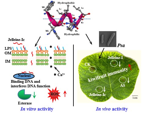 本网讯 近日,我校植物保护学院党向利副教授在农林科学领域国际权威期刊《Pest Management Science》(中科院1区,Top)上发表了题为“Antibacterial mechanism of the novel antimicrobial peptide Jelleine-Ic and its efficacy in controlling Pseudomonas syringae pv. actinidiae in kiwifruit”的研究性论文。本文中作者设计了一种新型的抗菌肽Jelleine-Ic,其对猕猴桃溃疡病菌(Psa)的抗菌活性远高于亲本抗菌肽。研究发现该肽对Psa的作用机制可归因于其对细胞膜和细胞内靶点的双重作用。Jelleine-Ic还可诱导猕猴桃抗Psa感染的防御基因的表达。在猕猴桃叶片中对Psa的防治效果达到70.53%,优于商品化杀菌剂。