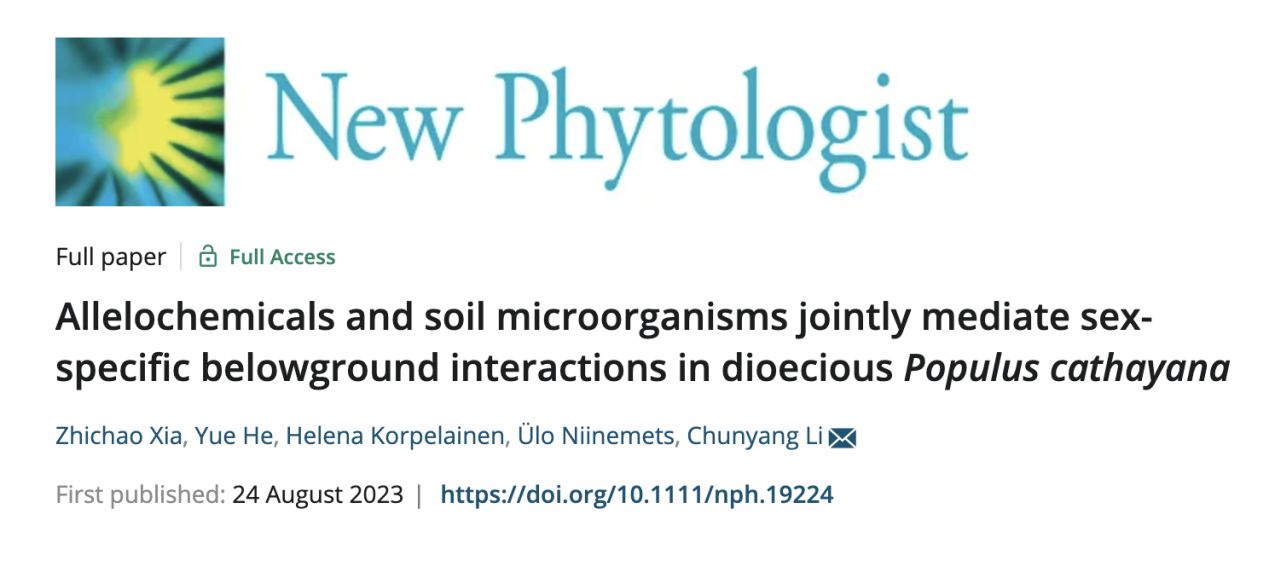 本网讯 近日,我校林学与园林学院夏志超教授团队在国际知名学术期刊《新植物学家》(《New Phytologist》)(IF = 9.4,中科院1区,TOP期刊)发表题为《化感物质和土壤微生物共同介导雌雄异株青杨地下性别特异性相互作用》(《Allelochemicals and soil microorganisms jointly mediate sex-specific belowground interactions in dioecious Populus cathayana》)的研究论文。