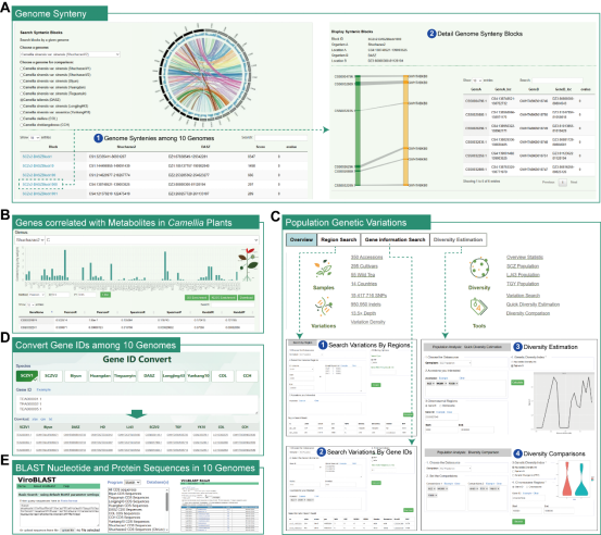 数据库目前主要包括7个栽培茶树品种和3个野生近缘种的参考基因组、21类茶树叶片发育/组织和生物与非生物胁迫的基因表达谱、116种山茶属植物的转录组、350种代表性茶树品种的遗传变异谱、107种山茶属植物的代谢谱(儿茶素,茶氨酸和咖啡碱)、17个茶树低温条件下的DNA甲基化组、10个基因组之间的共线块和直系同源基因以及系统的基因功能注释等信息。
