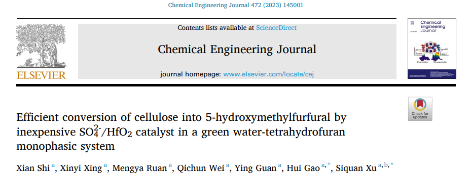 论文1:《绿色单相体系中磺酸改性氧化铪物种高效催化纤维素转化制备5-羟甲基糠醛》(Efficient conversion of cellulose into 5-hydroxymethylfurfural by inexpensive SO42-/HfO2 catalyst in a green water-tetrahydrofuran monophasic system)。林学与园林学院硕士研究生施羡为论文的第一作者,高慧教授和青年教师徐思泉为论文的共同通讯作者。该研究以磺酸基团嫁接改性的过渡金属氧化物物种(HfO2)为催化剂,结合无催化助剂的水与四氢呋喃溶剂,成功以纤维素为原料获得了高HMF产率。通过结构与性能研究发现其化学组成和反应条件显著影响该催化剂的酸性性能与催化活性并提出了该催化剂参与转化过程中的机理。另外该研究发现此催化剂在助剂与无助剂体系中均能获得优异的产率,符合当今绿色环保的理念,具有巨大的发展潜力。
