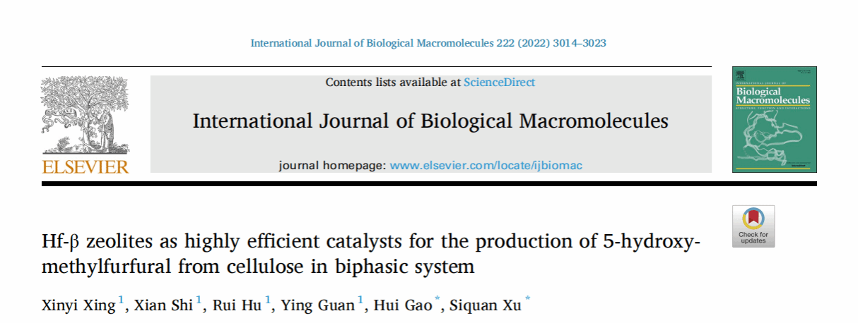 论文2:《Hf-β分子筛作为双相体系中纤维素生产5-羟甲基糠醛的高效催化剂》(Hf-β zeolites as highly efficient catalysts for the production of 5-hydroxymethylfurfural from cellulose in biphasic system)。林学与园林学院博士研究生邢馨忆为论文的第一作者,高慧教授和青年教师徐思泉为论文的共同通讯作者。该研究基于β分子筛成功地制备了一系列具有不同Hf元素含量的双功能酸催化剂(Hf-β)。适宜Hf元素的存在使得该催化剂具有优异的孔隙结构与均衡的Bronsted&Lewis酸度,促进了脱水和异构化步骤的持续进行。在以纤维素等不同碳水化合物作为底物转化时,该催化剂均能展现出良好的催化活性。此项研究工作为更复杂的生物质原料高值化利用提供了参考价值。