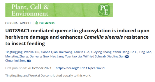 近期,安徽农业大学茶学国家重点实验室宋传奎/荆婷婷课题组和中国农科院茶叶研究所孙晓玲研究员合作在植物学经典期刊Plant, Cell & Environment上发表了题为“UGT89AC1‐mediated quercetin glucosylation is induced upon herbivore damage and enhances Camellia sinensis resistance to insect feeding”的研究论文,发现茶尺蠖幼虫取食可显著诱导茶树叶片中槲皮素-3-O-葡萄糖苷含量积累,并进一步解析了其参与茶尺蠖防御的新机制。研究结果提高了对茶树与茶尺蠖相互作用机制的认识,为类黄酮糖苷调控及其在茶树抗虫中的应用提供新思路。