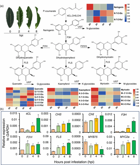 本网讯 类黄酮是茶树体内重要的次生代谢产物,其不仅是茶叶重要风味品质及健康属性形成的物质基础,而且在茶树的防御中发挥着关键作用。黄酮醇属于黄酮类化合物,是黄酮类化合物中数量最多,分布最广泛的一类,在茶树等植物的抗虫中发挥积极作用。黄酮醇在茶树中主要以糖苷形式储存,但截止目前其糖苷化机制及在茶树抗虫中的生理功能仍不清晰。