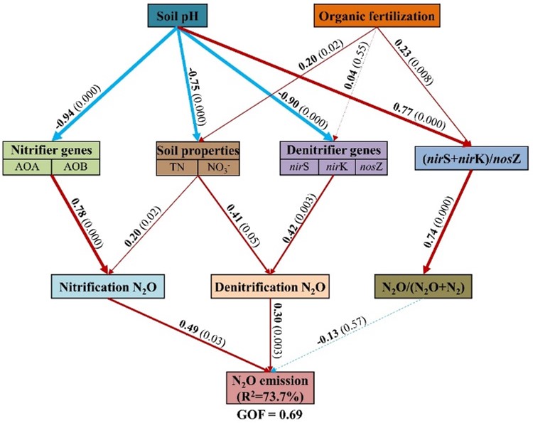 N2O是一种强效温室气体,其排放受到土壤pH和氮肥施用的显著调控。然而,目前土壤pH和氮肥施用类型对N2O排放的交互影响及其调控机制仍不清楚。该研究通过田间原位试验明确了不同酸度梯度(pH = 6.8、6.1、5.2、4.2)下施用化学氮肥和有机肥对N2O排放的影响,并通过室内培养试验和功能基因测序技术进一步探究了N2O变化的微生物学机制。结果表明,低土壤pH降低了硝化和反硝化产生的N2O,主要是由于AOA、nirS、nirK丰度受抑制、NO3-含量下降,最终导致酸性土壤N2O排放的降低。然而,由于 nosZ 丰度降低和(nirS + nirK)/nosZ 比率升高,酸性土壤提高了N2O/( N2O + N2) 反硝化产物比。与化学氮肥相比,施用有机肥提高了土壤养分有效性、nirK丰度和(nirS + nirK)/nosZ 比率,从而促进酸性土壤下反硝化产生的N2O和N2O/( N2O + N2)产物比。因此,在酸性土壤中施用有机肥会增加N2O排放。该研究为制定土壤酸化下N2O减排和作物绿色生产的氮肥管理策略提供了科学依据。
