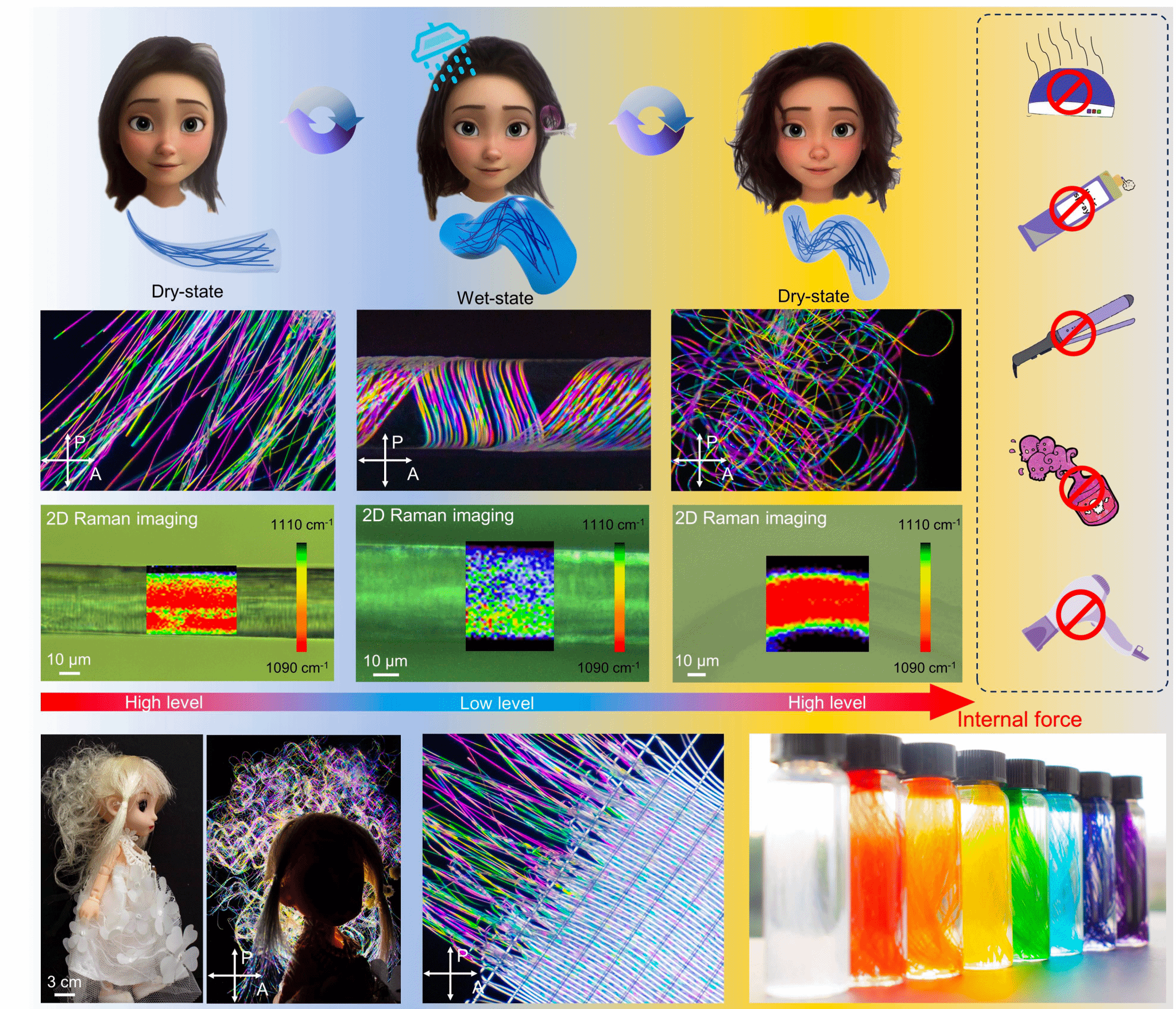 健康,便捷和美学的染发和造型对于时尚潮流和个人社交至关重要。本研究工作中,面向健康、便捷、时尚的人工发型和美学织物纤维替代需求,叶冬冬团队报道一类具有可定制虹彩颜色、优异力学性能、水触发三维可塑形性的美学再生纤维素纤维(简称ACF)。ACF的制造涉及纤维素溶解、交联、湿纺和取向过程。值得注意的是,该研究工作通过拉曼成像监测纤维素分子链中C–O-C基团的偏移,证明交联策略赋予ACF显著弱化的内应力,从而确保其通过湿态牵伸可呈现可调的虹彩颜色。有趣的是,通过简便的水触发可调内压力行为可实现ACF三维形状定制:即在湿态以低内应力状态进行塑形,并在干燥态以高内应力保持形态。此研究工作发展一类健康,便捷和绿色美学丝显示出在绿色时尚领域的巨大应用潜力。