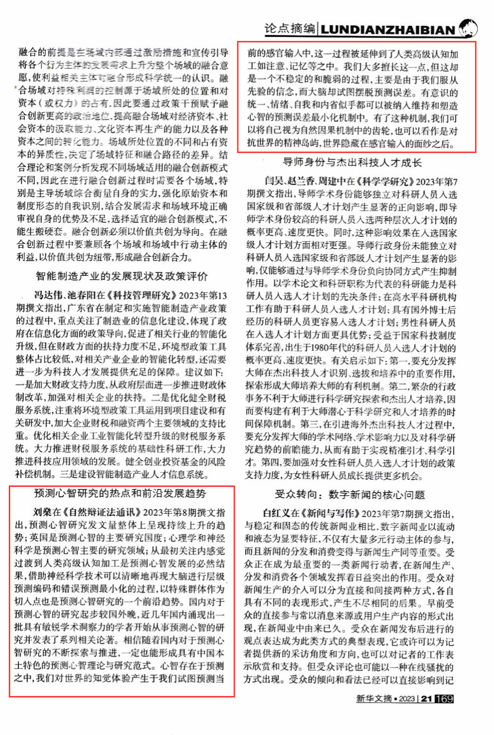 本网讯 我校人文社会科学学院教授刘燊于CSSCI来源期刊《自然辩证法通讯》2023年第8期刊发的论文《预测心智研究的热点和前沿发展趋势》被《新华文摘》2023年第21期论点摘编,摘编内容如下。
