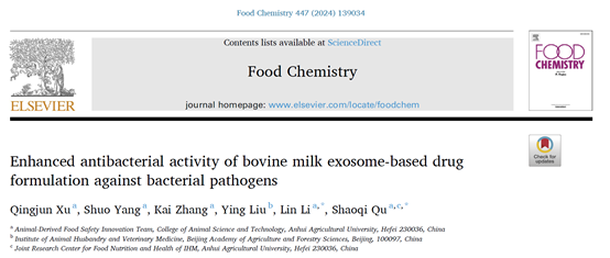 本网讯 近日,动物科技学院李琳教授团队在《Food Chemistry》(IF=8.8,中科院一区,Top期刊)上发表了题为“Enhanced antibacterial activity of bovine milk exosome-based drug formulation against bacterial pathogens”的研究论文,通过利用牛奶源胞外囊泡进行抗菌药物递送治疗细菌感染,拓展了牛奶源胞外囊泡在食品安全和生物医学方面的应用。