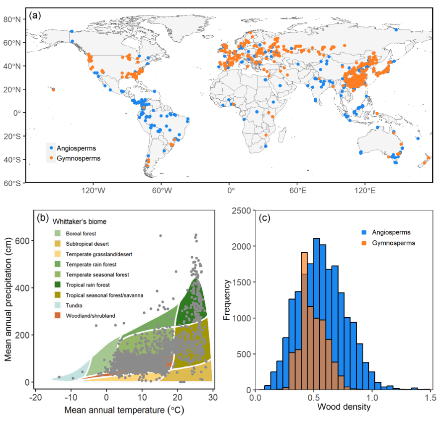 基于该研究结果,团队进一步研究了异速生物量模型中除树高和胸径之外的自变量——木材密度,收集并构建了包含2621个树种、7555个研究地点的27297个木材密度数据集,评估了不同分类(如被子植物和裸子植物)和生态(如热带、温带和寒带)树种群体的系统发育信号,探讨了木材密度的生物地理和系统发育模式,并量化了当前环境因素(如气候和土壤变量)和进化历史(即物种和谱系间的系统发育关联性)在驱动全球木材密度变异中的相对重要性。研究结果凸显了遗传进化在驱动植物功能性状变异中的重要性。相关工作于2024年以“Evolutionary history shapes variation of wood density of tree species across the world”为标题发表于Plant Diversity期刊。