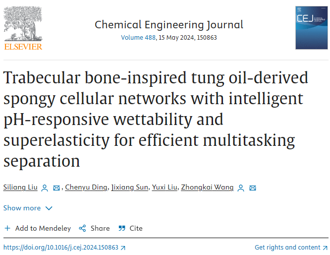 本网讯 近期,我校材料与化学学院刘思良副教授在植物油脂高值化利用领域取得进展,相关研究以“Trabecular bone-inspired tung oil-derived spongy cellular networks with intelligent pH-responsive wettability and superelasticity for efficient multitasking separation”为题发表在国际高水平期刊《Chemical Engineering Journal》(中科院一区TOP,IF=15.1)上。