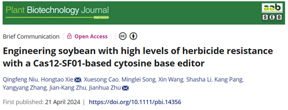 近日,生物学权威期刊Plant Biotechnology Journal (IF:13.8) 在线发表了安徽农业大学朱建华教授团队和牛庆丰教授团队的最新研究成果:题为“Engineering soybean with high levels of herbicide resistance with a Cas12‐SF01‐based cytosine base editor”的研究论文。并成功对大豆中催化3种支链氨基酸(缬氨酸、亮氨酸和异亮氨酸)生物合成的乙酰乳酸合成酶基因(Acetolactate synthase, GmALS)进行碱基编辑,创制出不含外源基因的高抗氟唑磺隆除草剂的大豆新种质。