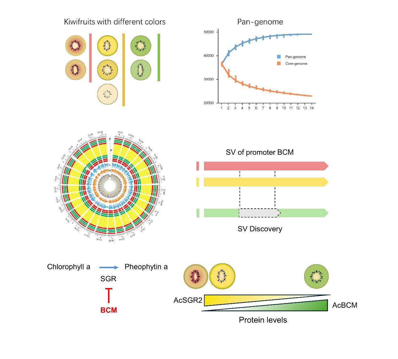 为了解析这一分子机制,该研究对7个中华猕猴桃的主要栽培品种(优系)开展了三代测序和单倍型基因组组装,同时构建了第一个猕猴桃泛基因组。基于构建的泛基因组图谱,该研究共检测到84,591个非冗余的结构变异,并重点对其中与中华猕猴桃果肉颜色(红肉、黄肉和绿肉)相关联的结构变异进行了筛选,发现了一个位于BALANCE of CHLOROPHYLL METABOLISM(AcBCM)基因启动子区域的结构变异特异存在于两个绿肉品种中。进一步研究证实,该结构变异能够导致AcBCM基因在果实发育后期的高表达,通过翻译后调控叶绿素分解代谢的关键酶Staygreen2(AcSGR2),从而阻止果实发育后期叶绿素的降解,表现出持绿表型。