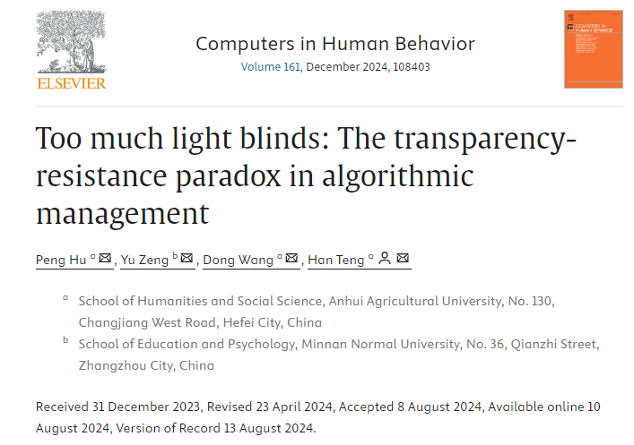 近日,我校人文社会科学学院胡鹏副教授在心理学领域国际顶刊《Computers in Human Behavior》(中科院一区Top,IF=9.0),在线发表了题为“Too much light blinds: The transparency-resistance paradox in algorithmic management”的研究论文,揭示了零工平台算法管理的透明性与员工抵抗行为之间的复杂关系。