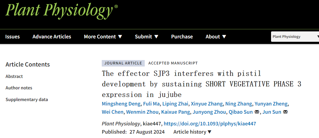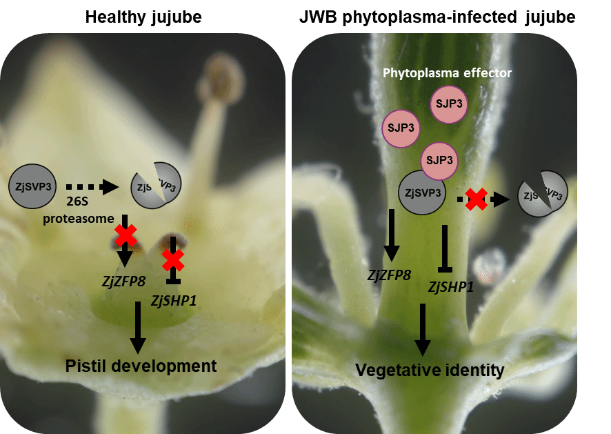 近日,安徽农业大学园艺学院孙俊课题组在国际植物学权威期刊Plant Physiology在线发表了题为“The effector SJP3 interferes with pistil development by sustaining SHORT VEGETATIVE PHASE 3 expression in jujube”的研究论文,系统阐明了枣植原体效应因子SJP3靶向稳定MADS-box转录因子ZjSVP3在病花持续表达,继而诱导雌蕊退化的分子机制。
