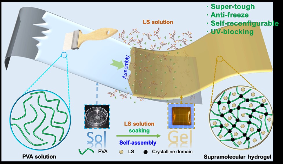 超分子水凝胶通常通过弱的非共价相互作用组装而成,这对实现超高强度构成了重大挑战。基于分子/纳米级工程概念开发更高强度的水凝胶是一种潜在的改进策略。我们团队通过逐步将木质素磺酸钠(LS)扩散到聚乙烯醇(PVA)溶液中,组装了一种强韧的超分子水凝胶。优化后的水凝胶表现出超强的机械性能,拉伸强度约为20 MPa,杨氏模量约为14 MPa,韧性约为50 MJ/m³,使其成为迄今为止最强的木质素-PVA/聚合物水凝胶。