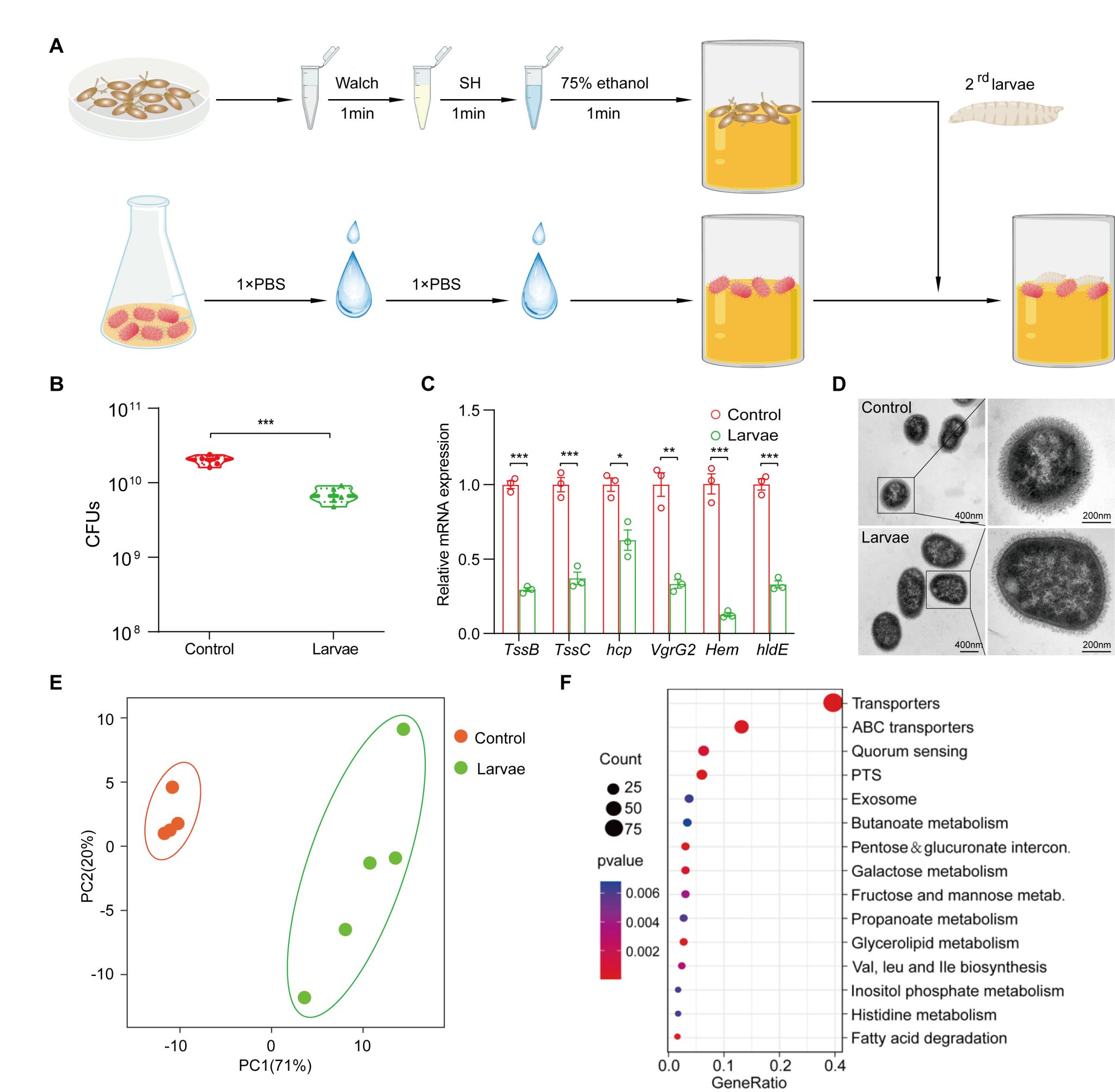 从昆虫到人类,所有的后生动物体内和体外生存着大量的共生菌。这些共生菌对宿主生理和病理中发挥着关键调控作用,也是现有的大多数研究主要的方向。事实上,宿主与共生菌的相互作用实际上是双向的,然而对二者互作的另一面:宿主调控共生菌生理和行为的科学问题却鲜有研究。针对上面的问题,刘威教授团队利用还原主义方法,以果蝇作为宿主模型,选择粘质沙雷氏菌作为代表性病原菌,通过构建无菌和悉生动物(图1A),系统地研究了宿主调控病原菌生活方式表型。本研究发现,宿主显著地降低病原菌的载菌量,减弱毒力基因表达,改变细胞包被形态结构,从而迫使其生活方式从致病性转向共生(图1B-D)。接着,该研究利用混池转录组(bulk RNA-seq)和代谢组技术,进一步解析宿主重塑粘质沙雷氏菌的转录谱和代谢谱(图1E和F),包括ABC转运、群体感应和外分泌等路径被宿主显著地降低。幼虫编码着多种抗菌肽,具有广谱抗菌活性的多肽类物质。最终,利用经典遗传学方法,鉴定也确认抗菌肽是调控粘质沙雷氏菌生活方式的关键宿主因素。