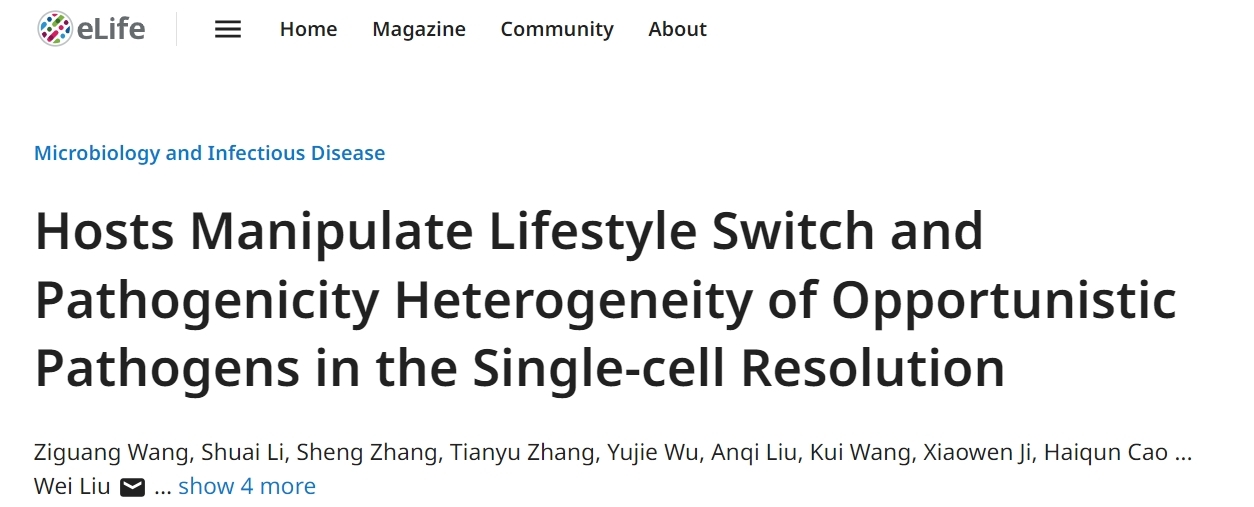 本网讯 近日,我校植物保护学院刘威教授团队在国际著名生物学综合期刊《eLife》(中科院1区)上正式刊登题为《Hosts Manipulate Lifestyle Switch and Pathogenicity Heterogeneity of Opportunistic Pathogens in the Single-cell Resolution》的研究性论文,报道了宿主作为重要因素可调控病原菌生活方式,并在单细胞水平上解析宿主调控病原菌毒力异质性的新机制,从而为人类精准防控病原菌提供理论基础。