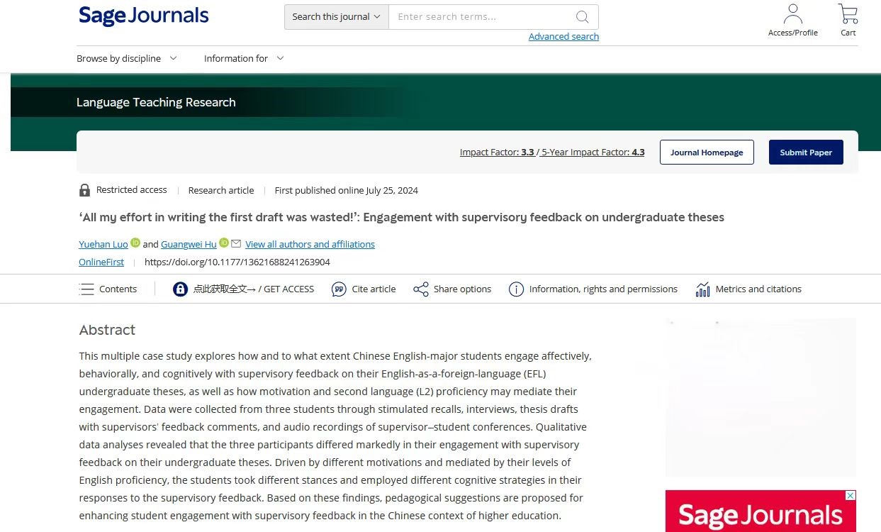 本网讯 近日,我校外国语学院英语系罗月寒博士在语言学领域国际期刊《Language Teaching Research》(中科院一区Top,IF: 4.3), 在线发表了题为“‘All my effort in writing the first draft was wasted!’: Engagement with supervisory feedback on undergraduate theses”的研究论文,该篇论文探讨了英语专业本科生对导师反馈的参与度及其影响因素。