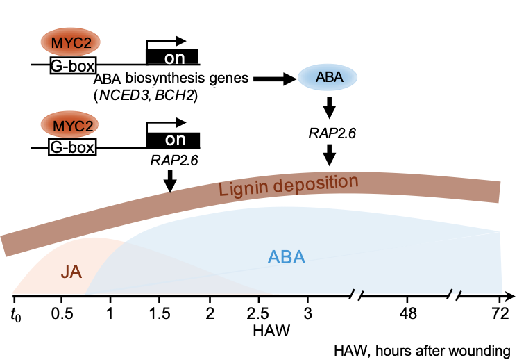 JA伤口响应是瞬时的,当JA信号通路被阻断时,RAP2.6的持续响应显著减弱,进一步证实了JA信号对RAP2.6表达的持久影响。更进一步发现, 脱落酸(ABA)持续响应伤口,当阻断ABA合成时,RAP2.6的伤口响应受到抑制,且木质素沉积相应减少(图2)。