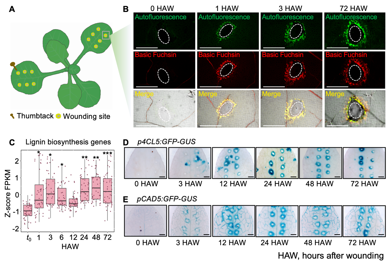 图1. 木质素在叶片伤口处快速且持续合成
