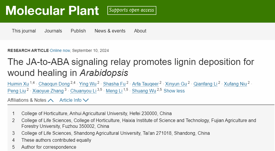 本网讯 植物在生长中常遇到虫害取食造成伤口,但植物伤口愈合机制尚未完全清楚。近日,我校园艺学院蔬菜器官发育与逆境适应团队在国际顶尖植物学期刊《Molecular Plant》上在线发表题为《The JA-to-ABA signaling relay promotes lignin deposition for wound healing in Arabidopsis》的研究论文,揭示了茉莉酸(JA)信号通过MYCs-RAP2.6模块在植物伤口愈合过程中调控木质素持续累积的关键作用。