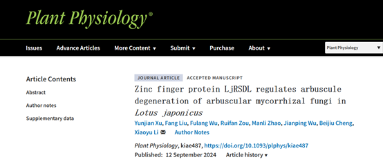 近日,我校作物抗逆育种与减灾国家地方联合工程实验室李晓玉教授团队,在植物学领域的权威期刊《Plant Physiology》(中科院1区)上发表了题为《Zinc finger protein LjRSDL regulates arbuscule degeneration of arbuscular mycorrhizal fungi in Lotus japonicus》的研究论文。该研究揭示了C2H2型锌指蛋白LjRSDL通过调节植物激素信号转导途径,从而控制丛枝菌根真菌丛枝的退化过程。